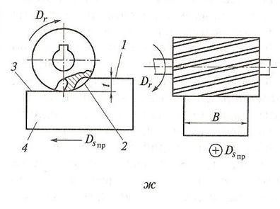 2 - поверхность резания; 3 - обработанная поверхность; 4 - обрабатываемая заготовка; Dr - главное движение резания; Dsпр, - движение продольной подачи; t - глубина резания; B - ширина фрезерования