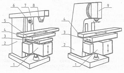 3 – салазки поперечного перемещения; 4 – стол; 5 – салазки продольного перемещния; 6 – шпиндель; 7 – хобот; 8 – серьга; б) вертикальный станок: 1 – консоль;