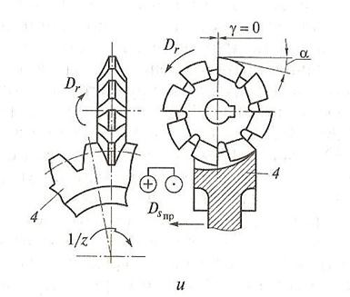4 - обрабатываемая заготовка; Dr - главное движение резания; Dsпр - движение продольной подачи; 1/z - окружной шаг зубчатого колеса(угол поворота зубчатого колеса с помощью делительной головки относительно модульной фрезы при нарезании