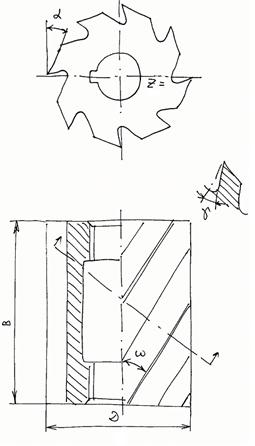 а) угол наклона режущей кромки w - угол между режущей кромкой и осью; б) передний уголg - угол между передней поверхностью и перпендикуляром к режущей кромке, проходящим через ось; в) задний уголa - угол между задней поверхностью и направляющей исходной инструментальной поверхности. К конструктивным параметрам относятся диаметр фрезы D, длина B и число зубьев z.