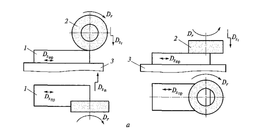 Рис. 4.17. Плоское шлифование периферией и торцом круга: 1 - заготовка; 2 - шлифовальный круг; 3 - стол для закрепления заготовки; Dst и Dsпр - движение поперечной