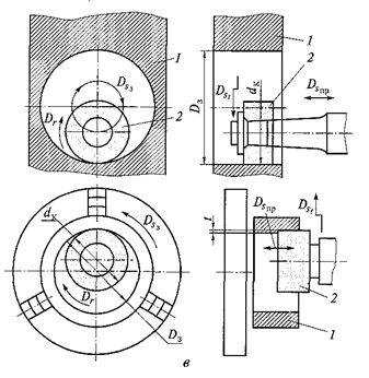 Рис. 4.19. Цилиндрическое внутреннее шлифование: 1 - заготовка; 2 - шлифовальный круг; dк и Dз - диаметры круга и заготовки; Dst и Dsпр - движение поперечной и