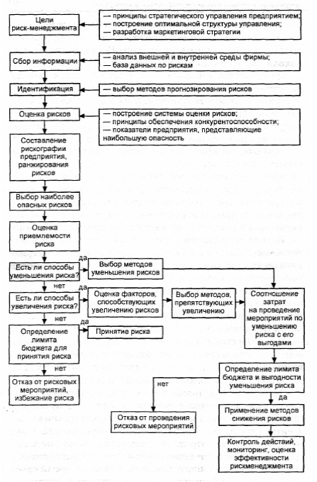 При комплексном подходе к построению системы управления рисками важно разработать принципы обеспечения конкурентоспособности и финансовой устойчивости предприятия, фирмы в условиях изменения внешней среды. Риск, сопровождающий те или иные управленческие функции, следует рассматривать не только как негативное явление, но и как возможность рационализации бизнеса и профессионального роста фирмы как субъекта рынка. В зависимости от масштабов деятельности фирмы и ее целей на определенный период времени, а также от складывающейся ситуации управление рисками может быть построено по-разному. В одном случае управление риском — это процесс выработки компромисса, направленного на достижение баланса между выгодами от уменьшения риска и необходимыми для этого затратами. В другом — процесс выработки оптимального, разумного решения по обеспечению баланса между выгодами от оптимизации рисками и затратами с точки зрения их сопоставления с приростом стоимости предприятия. Управление рисками — процесс эффективного использования потенциала и реальных возможностей фирмы в условиях риска.