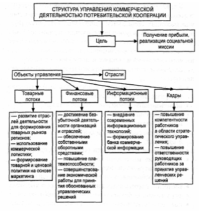 Управление коммерческой деятельностью потребительской кооперации представляет система мероприятий, учитывающих социальную направленность, конкурентные преимущества функционирования системы на товарном рынке, возможности использования межотраслевой интеграции для удовлетворения потребностей обслуживаемого населения в товарах и получения прибыли.