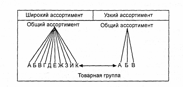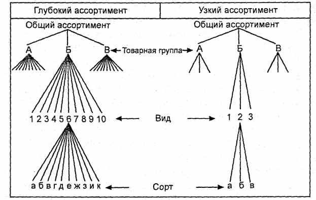 Широта охвата товаров, входящих в ассортимент, определяется количеством групп, подгрупп, видов, разновидностей, марок, типов, наименований. В зависимости от широты охвата товаров различают следующие виды ассортимента: