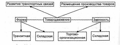 Процесс пространственного перемещения товаров образует так называемое товародвижение, включающее перевозки товаров различными видами транспорта, прохождение товарной массы через определенные складские звенья и доставку товаров в розничную торговую сеть — конечный пункт товародвижения. Товародвижение — весьма сложный технологический процесс; на его организацию оказывает влияние множество факторов (рис. 24).