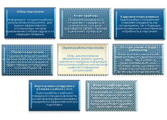 Оценка работы персонала призвана содействовать лучшему использованию человеческих ресурсов организации за счет тесной увязки заушаемых в ходе оценки, с другими направлениями работы с персоналом, в первую очередь, со следующими направлениями: