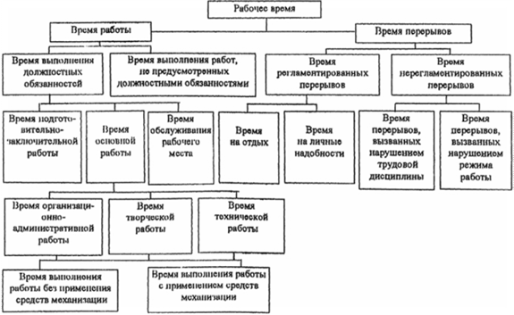 Все рабочее время служащих (время, в течение которого работник должен находиться на работе) принято делить на две части: время работы и время перерывов. Время работы - все то время, в течение которого работник занят деятельностью, имеющей отношение к управлению предприятием. Время перерывов охватывает всю остальную часть рабочего времени (когда работник не занят деятельностью, имеющей отношение к управлению).