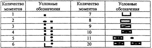 Проведение моментных наблюдений сопряжено с необходимостью быстрой записи данных. Эта быстрота обеспечивается использованием заранее заготовленной формы наблюдательного листа, в котором указаны виды затрат времени и отведено место для фиксации количества моментов по каждому виду затрат. Сама фиксация осуществляется чаще всего с помощью общепринятой системы обозначений, при которой каждый момент отмечается точкой или линией (табл. 3).