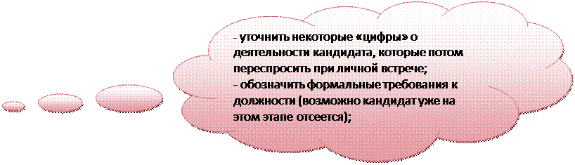 Произвести первичную оценку: собрать информацию о кандидате, его ценностях, мотивах. Заинтересовать вакансией и пригласить на собеседование. Собрать информацию о потенциальных кандидатах. Оставить позитивное впечатления о себе и о компании.