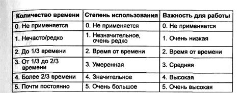 При анализе работы исследователь получает результат по каждому пункту, используя при этом определенные критерии. Разработано пять типовых критериев (степень использования, количество времени, важность для работы, вероятность происшествий, применимость) и специальные критерии. Все они имеют пятибалльную градацию, за исключением критерия применимости (для которого достаточно положительного или отрицательного ответа). Три из названных критериев и их градации представлены в табл. 8.2.