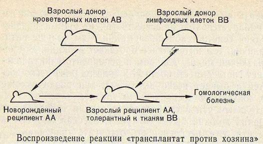 Органы при пересадке только стимулируют (индуцируют) иммунный ответ реципиента, сами же они инертны. Кроветворные и лимфоидные ткани содержат иммунологически компетентные клетки, которые помимо стимуляции иммунного ответа реципиента, сами способны иммунологически реагировать против реципиента.