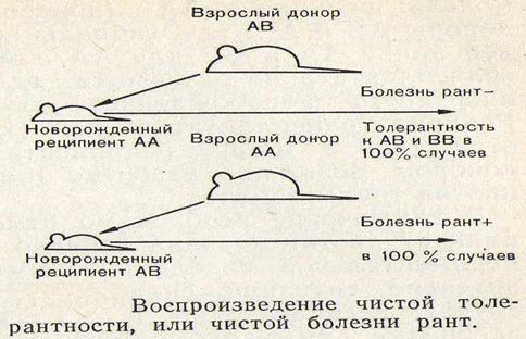 Основной аналитический эксперимент, объясняющий природу болезни рант как реакцию трансплантата против реципиента, проводится на животных двух чистых линий и гибридов между ними.(АА, ВВ и АВ). Введение новорожденным мышатам АА или ВВ лимфоидных клеток АВ никогда не приводит к болезни рант. Введение же клеток АА или ВВ мышатам АВ заканчивается развитием жесточайшего рантинга. Эти результаты закономерны в 100 или 50-70%.