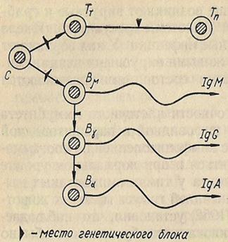 Генетическая блокада возможна на различных этапах дифференцировки Т- и В-клеток. Например, может быть нарушено превращение клеток-предшественников в эффекторные Т-клетки, клетки-помощники, супрессоры или может быть блокирован синтез маркеров, что приведет к нарушениям функции соответствующих субпопуляций Т-лимфоцитов. Аналогичные дефекты, связанные с блокадой процессов дифференцировки и созревания иммунокомпетентных клеток, могут наблюдаться и в В-системе иммунитета. Здесь возможна блокада дифференцировки пре-В-клеток в В-клетки, обусловленная отсутствием сумки Фабрициуса или ее аналогов, так и генетическими дефектами в стволовых клетках.