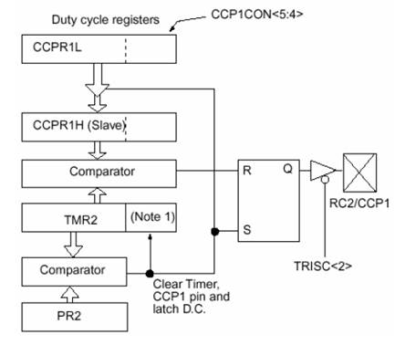 Длительность ШИМ- импульса задается значением регистра ССРR1L и двух бит ССР1СОN<5:4>: