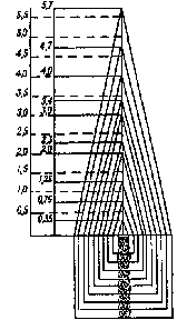 Изменение таксационных показателей ствола связано с возрастом, поэтому необходимо уметь определять возраст отдельного дерева. Различная окраска и плотность строения весенней и летней частей годичного слоя хорошо заметны на срезах стволов большинства древесных пород, благодаря чему можно определить возраст дерева по числу годичных слоев. Если сделать продольный разрез через сердцевину всего ствола от верхушечной почки до корневой шейки, то можно увидеть ряд конусовидных наслоений, плотно прилегающих друг к другу (рис. 13).