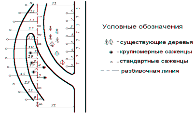 Рис. 10. Пример посадочного чертежа на часть объекта озеленения.