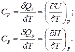 В зависимости от условий, при которых производится нагревание, различают теплоемкость при постоянном объеме СV (изохорную теплоемкость) и теплоемкость при постоянном давлении Cp (изобарную теплоемкость):