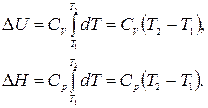 Интегрируя выражения (1.10) в интервале температур от Т 1 до Т 2, и принимая, что Cp и СV в указанном интервале температур постоянны, получим: