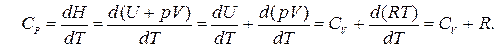 Установим взаимосвязь между Cp и СV для 1 моль идеального газа. В соответствии с уравнением Менделеева-Клапейрона (1.1)