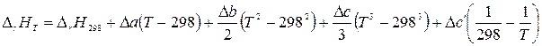 При интегрировании уравнения Кирхгофа часто используется температурная зависимость теплоемкости в виде степенных рядов, которые справедливы в определенном температурном интервале. Чаще всего интегрирование проводят в определенных пределах, приняв за нижний предел интегрирования температуру 298 К, а за верхний – температуру Т. Тепловой эффект реакции при 298 К можно легко рассчитать, используя первое или второе следствия из закона Гесса. В результате интегрирования получим: