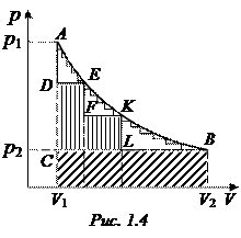 Исходное состояние системы (точка А) характеризуется давлением газа в цилиндре р 1 и объемом V 1, конечное состояние (точка В) – давлением р 2 и объемом V 2. Переход системы из начального состояния в конечное можно осуществить различными путями.