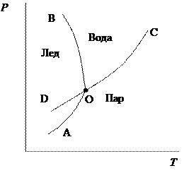 Если С = 0, то ни один из параметров состояния изменить нельзя. Это означает, что три фазы могут находиться в равновесии только при определенных условиях. На диаграмме такое состояние выражается точкой О, которая называется тройной. Если изменится Т или р, то изменится число фаз (система станет однофазной или двухфазной) и установится другое равновесное состояние.