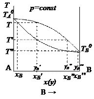 Компонент В является более летучим по сравнению с компонентом А, так как его температура кипения ниже. Согласно диаграмме данный раствор закипит при температуре Т и появится пар, состав которого равен уВ′. Сконденсировав образовавшийся пар, получим жидкую смесь, мольная доля компонента В в которой составит хВ′, причем хВ′ > xB. Если снова нагреть полученную смесь, то получим пар состава уВ″, при конденсации которого образуется жидкая смесь такого же состава хВ″ > хВ′. Повторяя указанные действия, получим практически чистые компоненты А и В (хВ′″ ≈ 100 %).