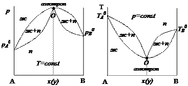 Для реальных растворов, характеризующихся значительными положительными или отрицательными отклонениями, компоненты которых имеют очень близкие температуры кипения или давления насыщенных паров, на кривых жидкости и пара наблюдаются точки экстремума.