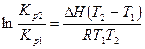 Применяя полученное уравнение, можно рассчитать средний тепловой эффект реакции, если известны значения констант равновесия в узком интервале температур или рассчитать Кp2, если известно Кр1 и средняя величина теплового эффекта реакции.