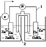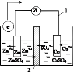 Электроны по внешней цепи (1) перемещаются от цинкового электрода к медному. Избыток электронов придает пластине отрицательный заряд. На медном электроде идет реакция восстановления ионов меди (медь осаждается на пластине). Медная пластина заряжается положительно и масса ее увеличивается. По внутренней цепи (2) перемещаются ионы. Процессы, протекающие в гальваническом элементе, описываются суммарной реакцией: