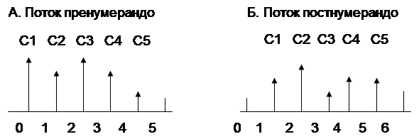 При проведении финансового анализа временные периоды чаще всего предполагаются равными. Для упрощения расчетов предполагается, что генерируемые в рамках одного временного периода поступления или расходы не распределены внутри периода, а сконцентрированы либо в его начале, либо в его конце. В первом случае денежный поток называется потоком пренумерандо, или авансовым, во втором — потоком постнумерандо (рис.2.1).