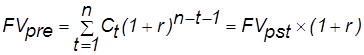 Рассмотрение того же самого потока как потока пренумерандо приводит к тому, что каждый элемент денежного потока наращивается на один период дольше, откуда следует, что:
