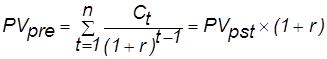 Несложно увидеть, что рассмотрение того же самого потока как потока пренумерандо приводит к тому, что каждый элемент денежного потока дисконтируется на один период меньше, откуда следует, что: