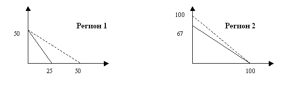 Тогда при полной специализации региона 1 на пшенице, а региона 2 на сукне кривые производственных возможностей займут новое положение (рис. 3).