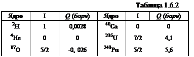 Величина Q положительна для вытянутых ядер (b > a), отрицательна для сплюснутых (b < a), и равна нулю (b = a) для ядер, имеющих сферическую симметрию. Таким образом, квадрупольный момент является мерой отклонения распределения электрического заряда от сферически-симметричного. Квадрупольный момент имеет размерность площади и обычно измеряется в единицах барн, 1 барн = 10‑24 см 2. В таблице 1.6.2 приведены величины Q для нескольких ядер. Как следует из таблицы 1.6.2, существуют ядра как вытянутые, так и сплюснутые. Степень вытянутости можно характеризовать величиной отношения полуосей эллипсоида