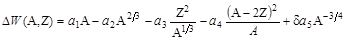 где a 1, … a 5, и d - постоянные величины. Коэффициенты, a 1, …, a 5 подбираются таким образом, чтобы получить наилучшее согласие со значениями энергии связи для большинства всех известных ядер. Коэффициент а 3 может быть вычислен теоретически (см. ниже).
