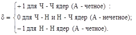 Последний член в формуле (2.2.4) отражает распространенность стабильных элементов и учитывает эффект спаривания одинаковых нуклонов (см. §1.4 п.3). Ядра, у которых числа N и Z - четные (Ч-Ч ядра) имеют удельную энергию связи примерно на 1 Мэв большую, чем соседние ядра, у которых либо N, либо Z - нечетные (Ч‑Н и Н-Ч ядра). Ядра с нечетным числом и протонов, и нейтронов (Н-Н ядра) имеют наименьшую удельную энергию связи среди соседних ядер. Стабильных ядер последнего типа, как отмечалось в §1.1, известно всего четыре.В соответствии с этим величина δ в пятом члене формулы Вейцзеккера принимает три значения: