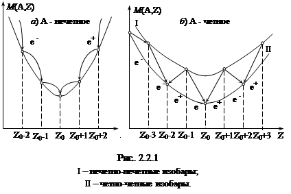 4. Найти Z0 нуклида, устойчивого по отношению к β-распаду, для любой группы изобар. На рис. 2.2.1 представлена зависимость (2.2.6) массы ядра от Z для ядер изобаров, имеющих нечетное число нуклонов (а) и – четное число нуклонов (б). Кривые построены в соответствие с формулой (2.2.6) и их следует понимать условно, так как физический смысл имеют значения массы ядер только для дискретных значений Z. Переходы в состояния с меньшей массой показаны на рисунке стрелками. Кривая I на рис. 2.2.1 б) соответствует нестабильным относительно β-распада нечетно-нечетным ядрам. Причем некоторые из ядер могут испытывать (см. §3.5) как электронный распад, так и позитронный распад, или же Е ‑захват. Изобары, лежащие на кривой II, могут иметь по несколько стабильных нуклидов, так как двойной β-распад неизвестен.