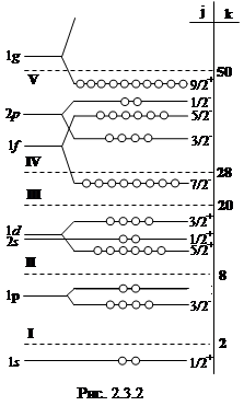 Для получения системы одночастичных уровней нейтронов конкретного ядра (A,Z) задают константы в (2.3.2) и (2.3.3) и решают уравнение Шредингера. При переходе от ядра к ядру эти константы приходится подбирать вновь. Оказалось, что, подбирая значения констант, можно получить группы тесно расположенных уровней, которые принято называть оболочкой. Оболочки, в свою очередь, разделены относительно большими энергетическими промежутками (рис. 2.3.2).