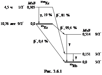 На рис. 5.6.1 показан смешанный распад метастабильного уровня ядра 85Kr. Из-за большой разности спинов изомеров только в 19 % происходит γ-переход и образование изомера с низшей энергией, а в 81 % β--распад с образованием ядра 85Kr в возбужденном состоянии. Обращает внимание большое различие в периодах полураспада для основного и возбужденного состояний.