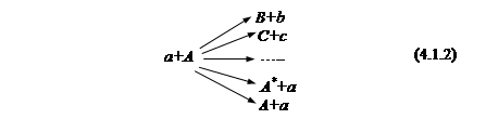 Здесь частица а – бомбардирующая частица, ядро А – ядро-мишень. Обычно частицы а и b представляют: нейтрон (n), протон (p), дейтон (d), α-частицу (α-), γ-квант (γ-). Существует сокращенная запись процесса (4.1.1): A (a,b) B. В скобках обычно указываются частицы с меньшей массой. Используется также запись (a,b), когда речь идет только о типе ядерной реакции безотносительно к ядру-мишени и образующемуся ядру. Например, (p,n), (α,n), (γ,p) и т.д. Первой в скобках указывают бомбардирующую частицу, а второй – частицу, возникшую в результате реакции. Начальный этап реакции а+А называют входным каналом, а конечный b+B - выходным. Реакция может протекать неоднозначно и иметь несколько конкурирующих между собой выходных каналов: