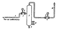 1 - соединительная труба; 2 - штуцер; 3 - сепаратор; 4 - замерное устройство; 5 - термокарман; 6 - замерные вентили; 7 - сливной кран; 8 - факельная линия.