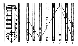 На схеме работы лифта показано: позиции 1,7 - шарик и втулка свободно падают в восходящем потоке газа; 2,8 - шарик сел на нижний амортизатор под. уровень жидкости; 3 - втулка соединяется с шариком под уровнем жидкости; 4,5 - втулка с шариком и жидкость поднимаются потоком газа; 6 - шарик и втулка упираются в верхний амортизатор, шарик отделяется от втулки и падает вниз на нижний амортизатор.