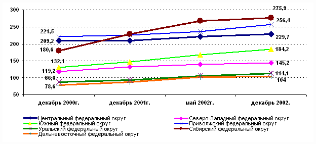 | 2002г. к 2001г. | 107.8 | 116.4 | 103.2 | 102.2 | 105.4 | 104.0 | 99.1 |