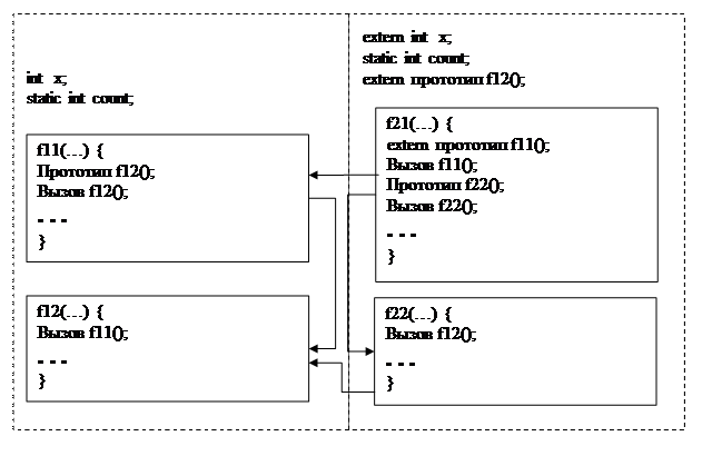 При вызове функции из другого модуля нужно объявить ее как extern и далее описать прототип. В этом случае функция становится видна в другом модуле. Если объявление глобально, то ее можно вызывать в любой функции данного модуля. Если объявление локально, то она доступна только в той функции, где сделано объявление.