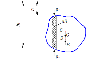 Пусть тело произвольной формы полностью погружено в жидкость (рис. 17). Выделим цилиндрическую часть этого тела с бесконечно малой площадью поперечного сечения.