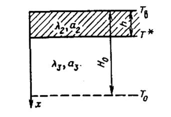 Сформулируем задачу: на поверхности полупространства в момент времени t =0 устанавливается отрицательная температура Тв, равная температуре внешней окружающей среды. В процессе промерзания связной породы образуется промерзший слой переменной толщины h = f (t). Нижняя граница этого слоя всегда имеет температуру замерзания влаги Т*. На этой границе происходит фазовый переход «вода-лед», при котором выделяется теплота перехода Lф, Дж/кг. На глубине залегания нейтрального слоя Н0 температура всегда постоянна и равна примерно 277 К (4°С). Обозначим эту температуру через Т0. Кроме этого, условимся обозначать в данной и последующих задачах этой темы параметры теплоизоляционного покрытия индексом 1, промерзшей связной породы — индексом 2 и талой — индексом 3.