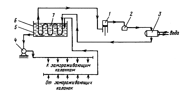 Компрессором 1 пары хладоагента сжимаются до 0,6-1,2 МПа, при этом его температура повышается до 353÷473 К (80-100 С). Из компрессора пары хладоагента, пройдя маслоотделитель 2, поступают в конденсатор 3. В нем хладоагент конденсируется на трубах, по которым циркулирует вода. Температура хладоагента при этом понижается до 288÷298 К (15÷250С). Из конденсатора жидкий хладоагент поступает в испаритель 4, где за счет резкого снижения давления до 0,05-0,15 МПа, происходит испарение хладоагента. температура образующихся паров хладоагента понижается до 243÷253 К (минус 30÷20°С). Пары хладоагента поднимаются по змеевику испарителя и снова поступают в компрессор. Змеевик помещается в рассольном баке 5, в котором находится жидкий хладоноситель 6 (рассол). Из рассольного бака с помощью насоса 7 хладоноситель подается к замораживающим колонкам. После возврата хладоносителя к устью замораживающих колонок он снова поступает для охлаждения в рассольный бак.