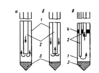 На рис. 3.3, а изображена прямая цируляции хладоносителя в замораживающей колонке, когда входящий поток хладоносителя подается по центральной трубе, а исходящий выдается по коаксиальному зазору между внутренней и внешней трубой.